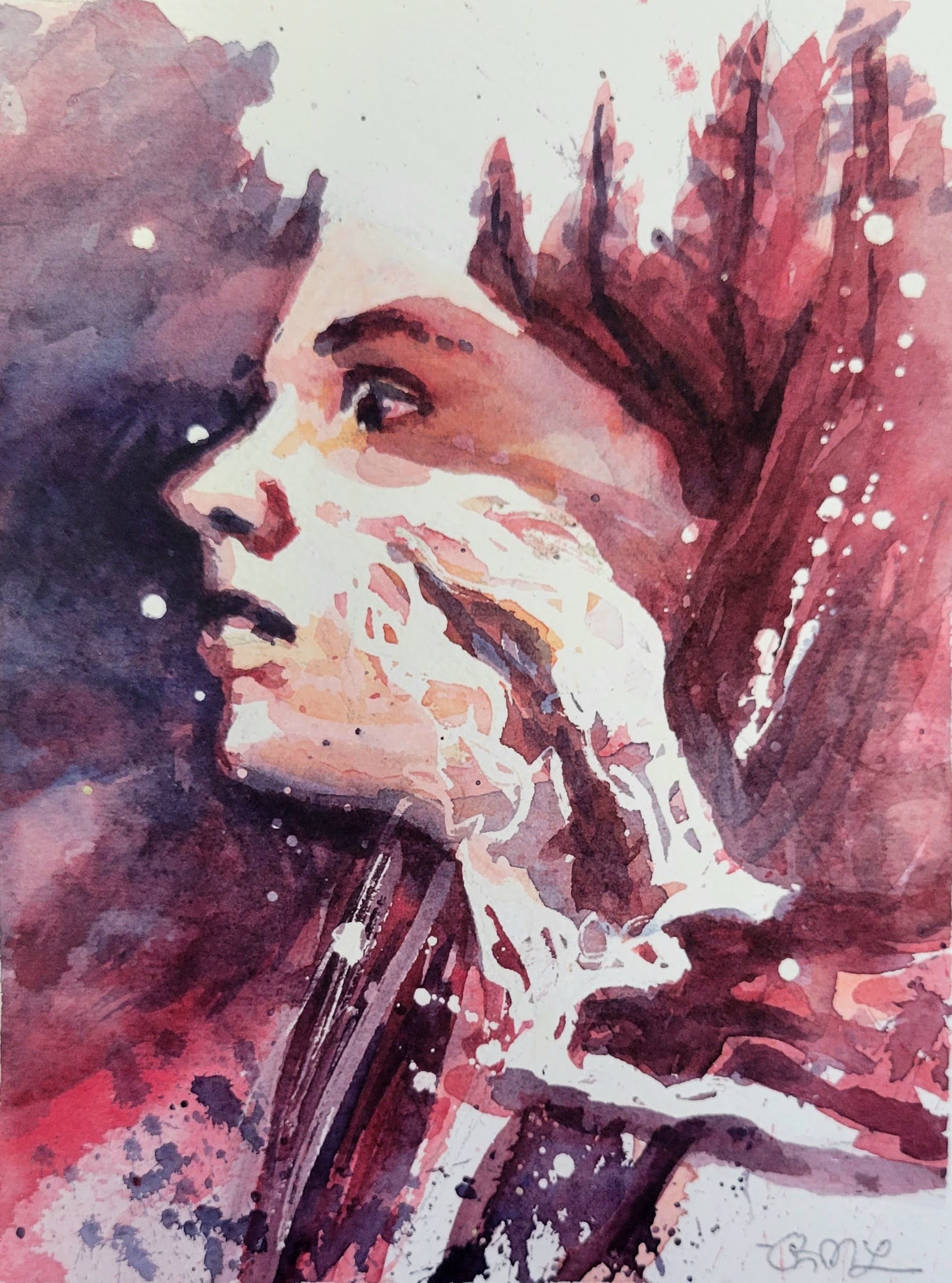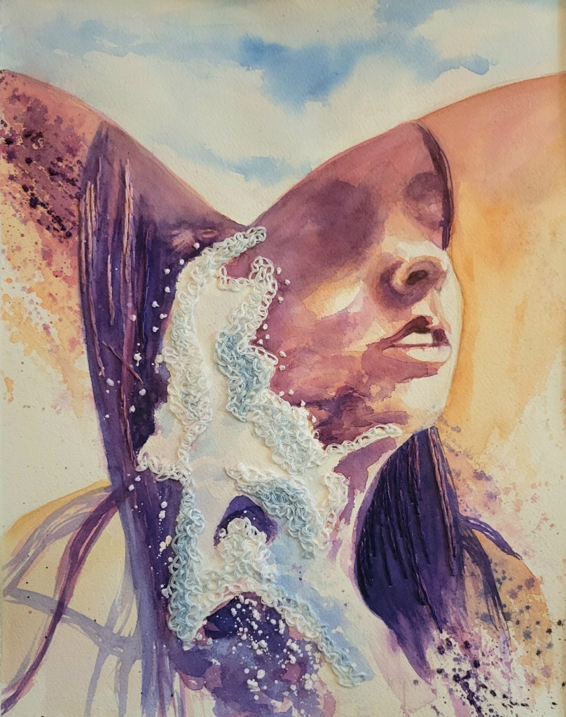 The bottom section includes my initial monochromatic studies from 2022. My process has evolved a bit since then, and I have started incorporating embroidery into my paintings, as seen below.