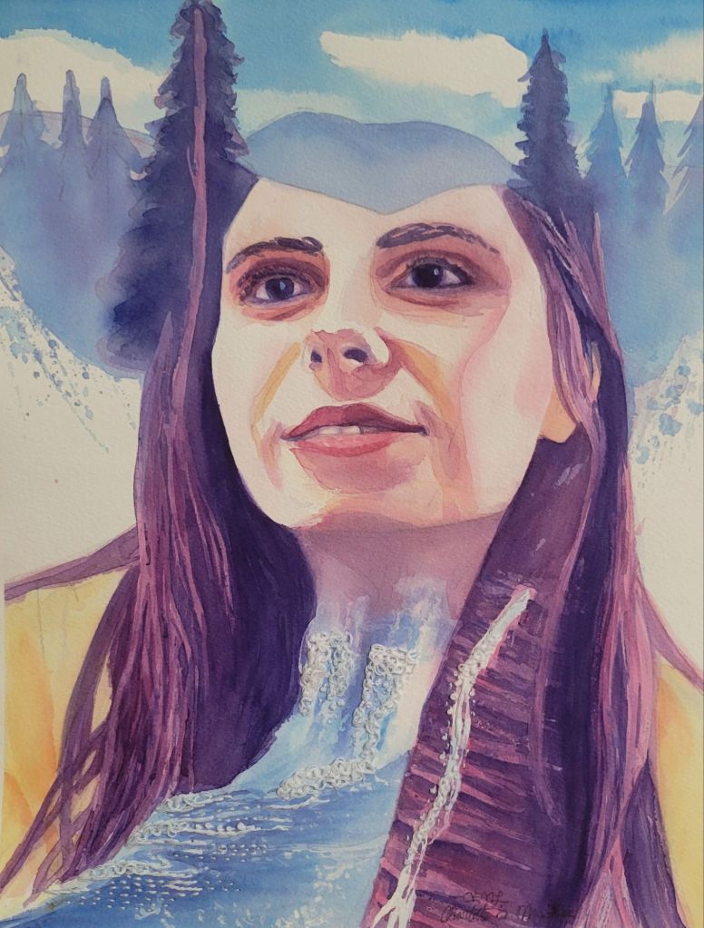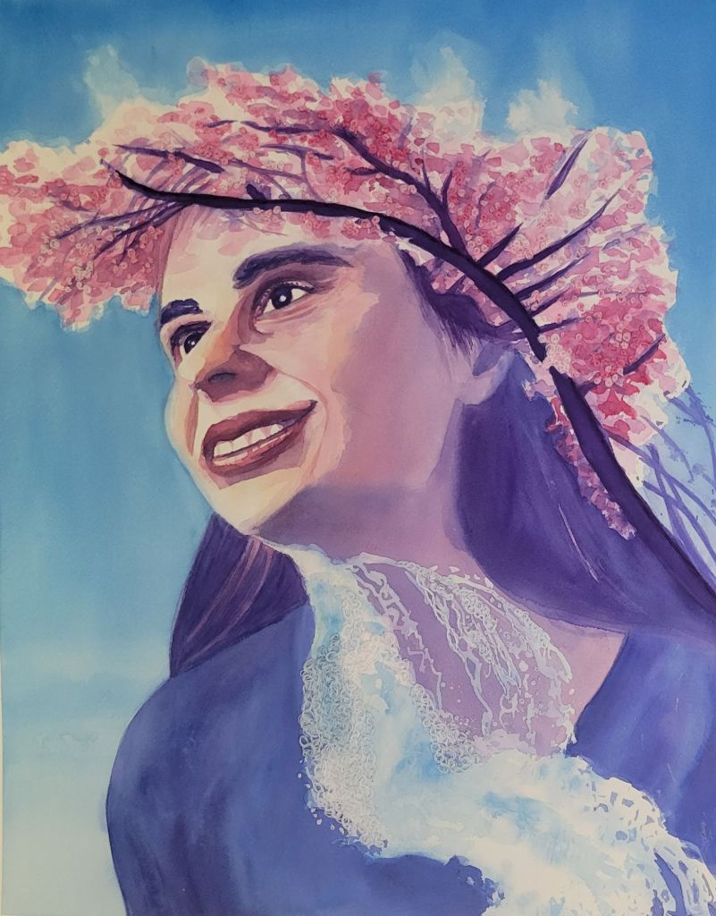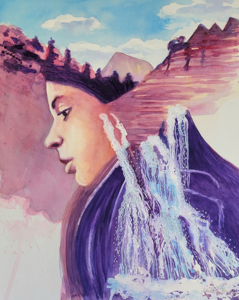 In Hebrew, the word for “healing” is Rapha (רָפָא), literally, “to mend by stitching.” The slow, methodical process of embroidery parallels the gradual experience of recovery. It often feels as if no progress is happening, but little by little, stitch by stitch, an image emerges. I stitch natural imagery, including water, mountains, trees, and flowers, which represent the promises of God’s redemption and restoration in Isaiah that have encouraged me during difficult times. For instance, the verse, “Water will gush forth in the wilderness” (Isaiah 35:6) reminds me of how God will bring refreshment (“water”) amidst spiritual desolation (“wilderness”). The fluidity and transparency of watercolor enhance the water motif in these paintings and convey the unseen, spiritual side of life.