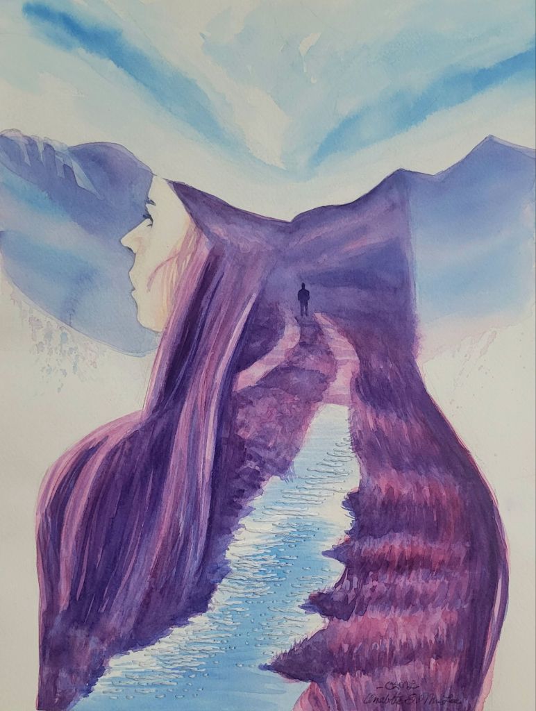 Through each drip of paint and pull of thread, I process my emotions and respond to God in worship. In this series, double exposure, the technique used to overlap self-portraits and landscapes, embodies my journey of healing from past trauma, allowing me to express myself through ups and downs while meditating on God’s promises of redemption.